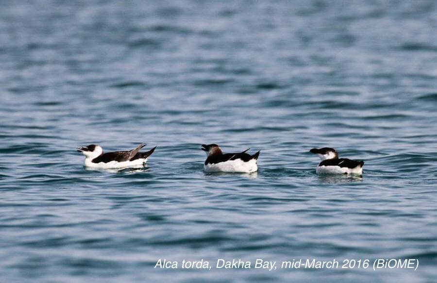 Three, maybe six, Razorbills (Petit Pingouin, Alca torda) in Dakhla Bay mid-march (BiOME, FB). See also Aourir, M. ; Radi, M. ; El Idrissi Essougrati, A. ; Qninba, A. & Swann, R. 2016. Nouvelles observations du Petit Pingouin Alca torda (Linnaeus, 1758) dans le sud du Maroc. Go-South Bulletin 13 : 49-54.