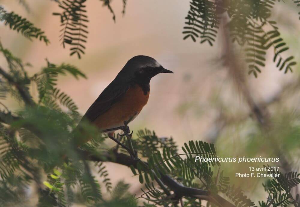• plusieurs Rougequeues à front blanc Phoenicurus phoenicurus. Les mouvements prénuptiaux culminent de fin mars à fin avril dans le Sahara Atlantique marocain