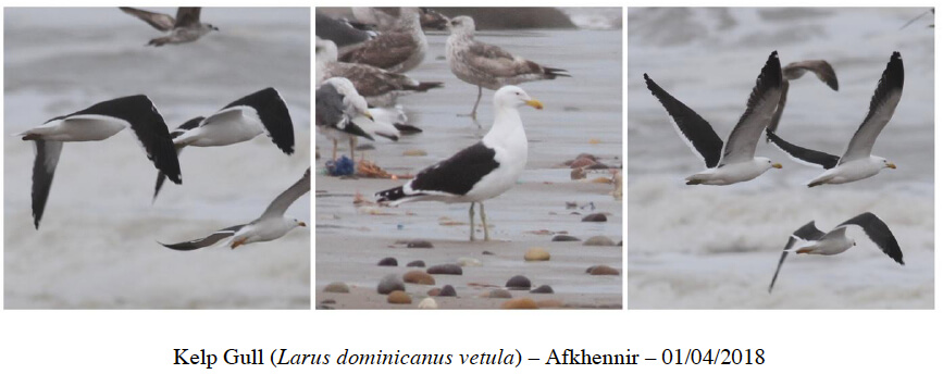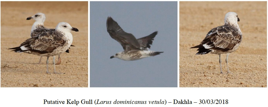 - Kelp Gull: one putative bird at Pointe de La Sarga, Dakhla, 30 March, and two at Akhfenir, 1 April