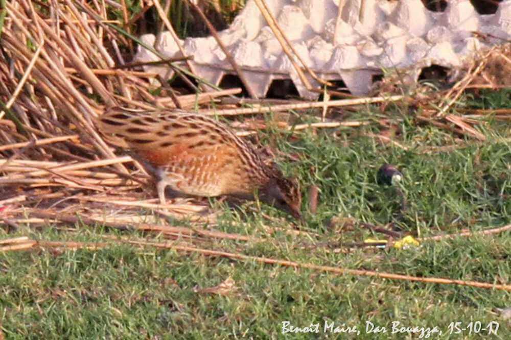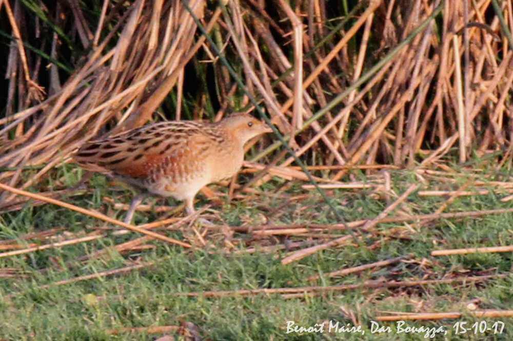 Un Râle des genêts (Corncrake, Crex crex) à Dar Bouazza le 15 octobre. Ce site est vraiment étonnant ; malheureusement la commune de Dar Bouazza a le projet d’installer un système de pompage permanent et un château d’eau au niveau de la source qui coule déjà fort peu en ce moment… La sauvegarde des dernières zones humides du Maroc est bien difficile (Benoit Maire)
