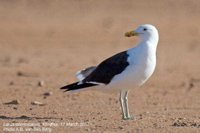- At Lagune de Khnifiss, six adult Great Black-backed Gullswere seen by telescope just before sunset of 17 March at the rocky hill in the centre; three of them were standing and showing pink legs, two were stretching the wings obviously showing the largish amount of white in the wing tip, clinging the identification. The next day at noon, 18 May, no large gulls were standing here (so, no nesting is going on yet), and only one pair of swimming presumed Great Black-backeds was noted.