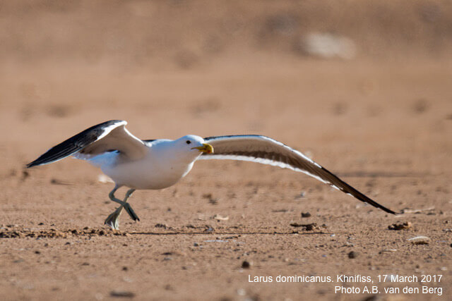 - In the afternoon of 17 March, on the beach south of Akhfennir, first a pair of two adult Kelp Gulls (Cape Gulls) was photographed, and then a single bird which was either an adult or a near-adult (based on bill smudges and wingtip); the pair was always standing and flying together while the single bird did not show any relationship. 18 March: in the morning, the three Kelp Gulls were present again (the pair and the single one separate) on the beach south of Akhfennir, in the afternoon, all three birds frequented the village’s dump. Above, one picture of the pair at the shoreline (one standing) and, below, two of the single bird.