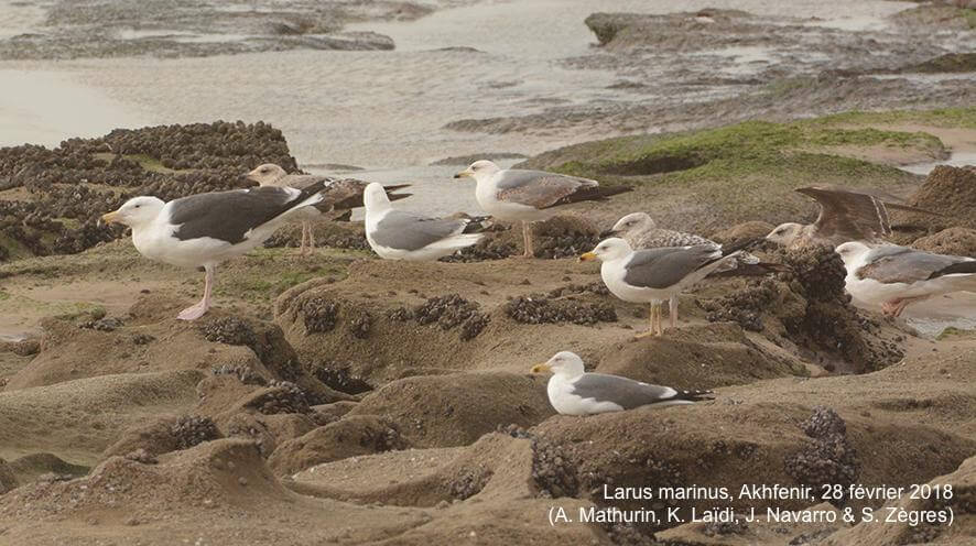 - 1 Goéland à ailes blanches et 1 Goéland marin le 28 février 2018 sur la plage au sud d’Akhfenir (1 Iceland Gull and 1 Great Black-backed Gull on February 28, 2018 on a beach South of Akhfenir)