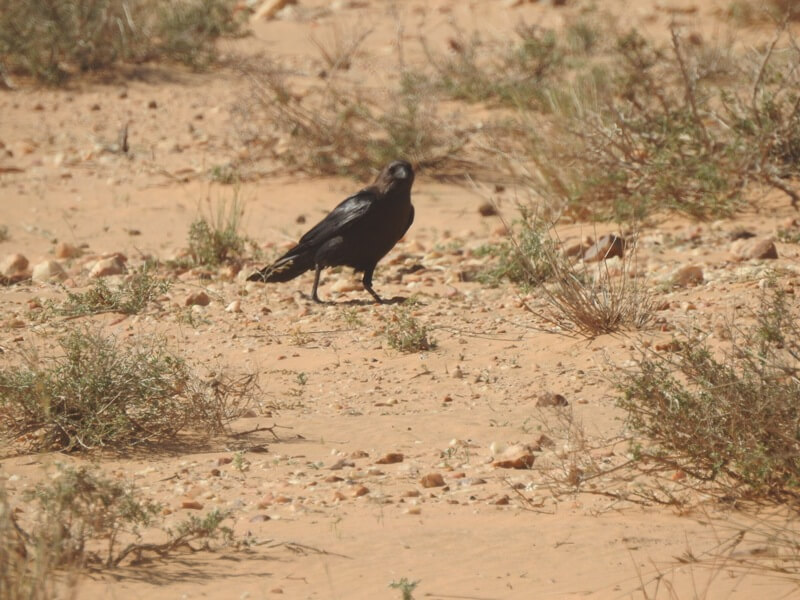 Corbeau brun adulte qui couvait un nid sur l’Acacia et envolé à l’approche des observateurs.
