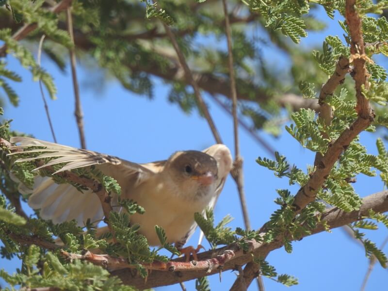 Moineau du désert juvénile volant quémandant de la nourriture sur l’Acacia.