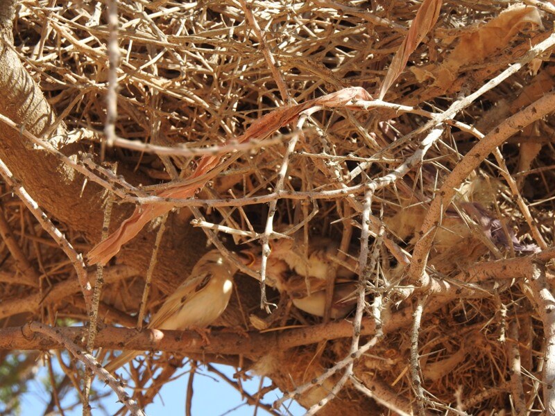 Le nid du Moineau du désert, était déjà occupé par deux juvéniles emplumés nourris alternativement par le mâle et la femelle à l’entrée du nid alors qu’un troisième juvénile capable de voler était nourri sur des branches du même arbre.