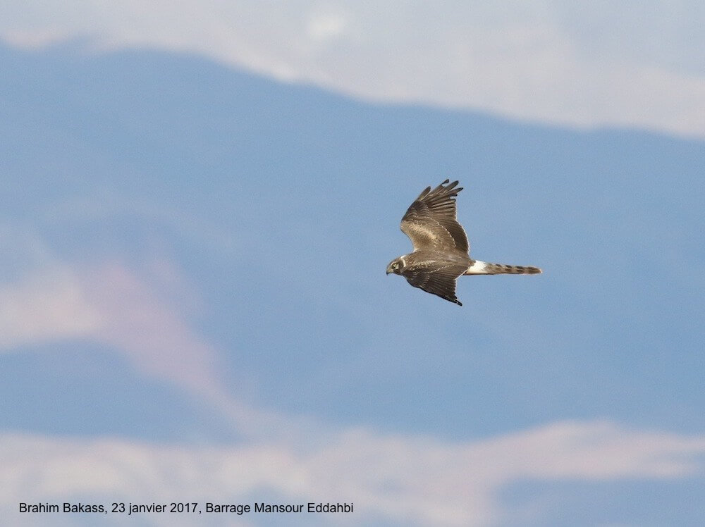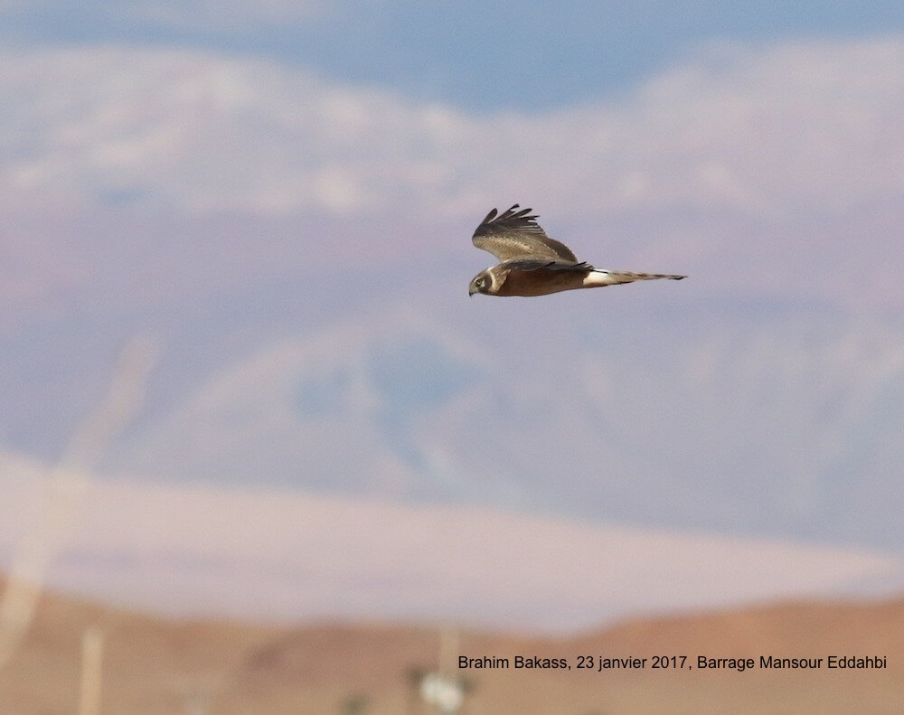 Un jeune Busard pâle Circus macrourus ainsi qu’un Busard St Martin Circus cyaneus mâle adulte au barrage Mansour Eddahbi (Ouarzazate) juste avant le coucher du soleil le 22 janvier ; le 23 janvier, le jeune Busard pâle est toujours là (Brahim Bakass)