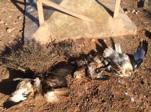Trois Buses féroces trouvées électrocutées récemment au pied d’un poteau électrique. Restes d’un Aigle de Bonelli au pied d’un poteau électrique (Karim Laïdi, Brahim Bakass et Juan Navarro)
