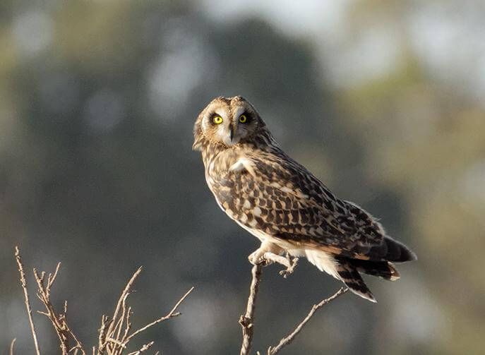 Le Hibou des marais (Short-eared Owl, Asio flammeus) est un migrateur et hivernant rarement observé au Maroc, de fin septembre à fin avril.