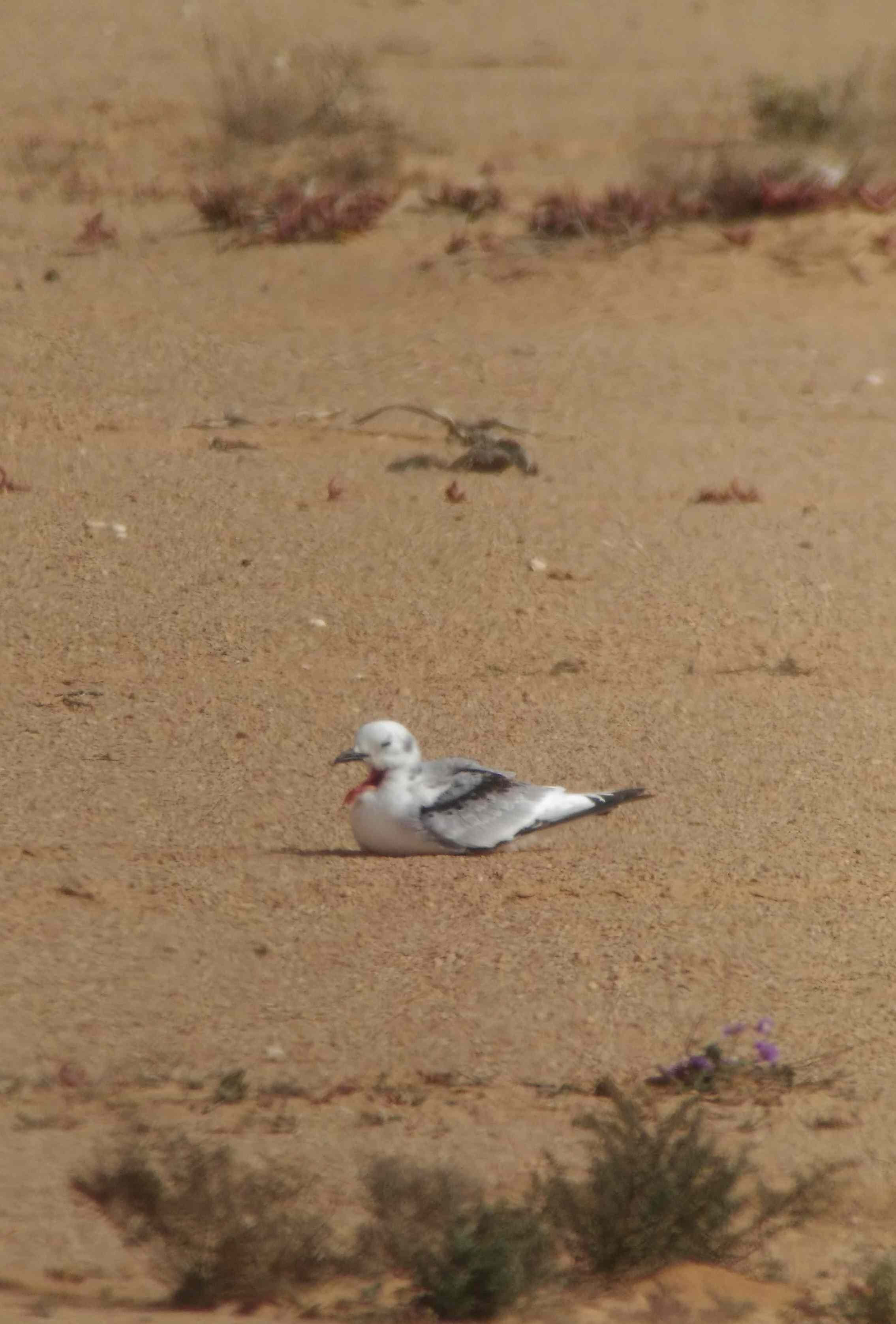 - 16 janvier, 15 km au sud du Café Chtoukane : une Mouette tridactyle juvénile volant en longeant la route vers le nord puis se posant : oiseau blessé à la gorge, visiblement très faible (photo ci-dessous).