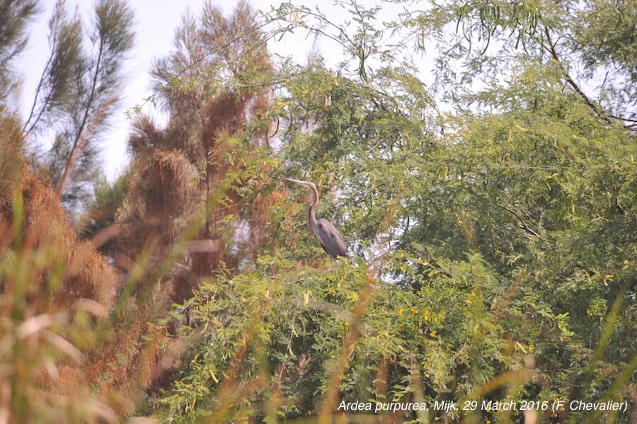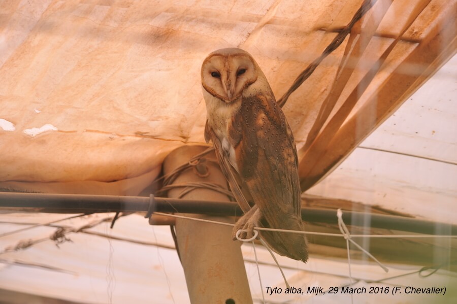 A Mijk le 29 mars, une Effraie des clochers (Tyto alba, Common Barn-owl) entrée dans une serre ; une quinzaine de Hérons pourprés (Ardea purpurea, Purple Heron) au niveau de la roselière, nombre le plus important jamais noté dans la région de Dakhla ; une dizaine de Guêpiers d’Europe (Merops apiaster, European Bee-eater) et un Circaète Jean-le-Blanc (Circaetus gallicus, Short-toed Snake-eagle) (Franck Chevalier & Mohammed Belhaj)