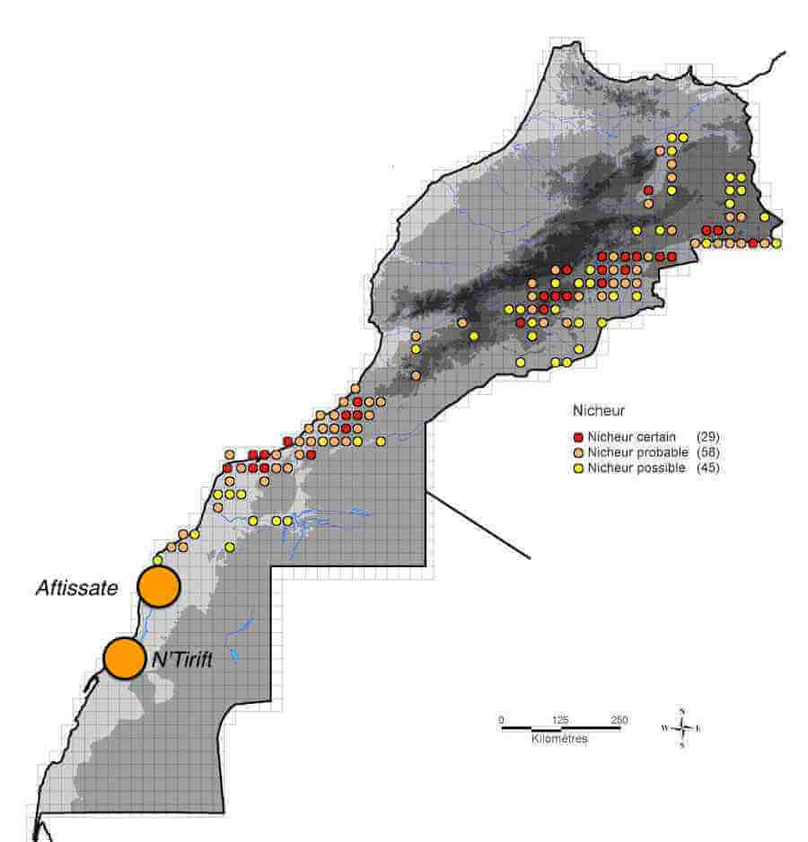 La carte présentée dans Bergier et al. 2013 (Bergier, P. ; Thévenot, M. ; van den Berg, A.B. & The Sound Approach 2013. Distribution, habitat, identification and taxonomy of Streaked Scrub Warbler in Morocco. Dutch Birding 35: 107-121) doit être adaptée.