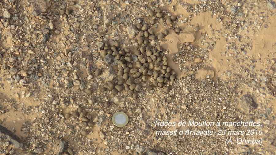 Il existe donc encore quelques animaux sur ce massif, contrairement à ce que j’avais publié dans mon article sur le Mouflon à manchettes dans l’Adrar Souttouf. J’ai identifié également quelques empreintes de pattes et des crottes relativement récentes. La cause de la mort du jeune mouflon n’a pas pu être déterminée‘ (Abdeljebbar Qninba)